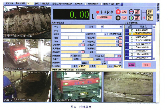 汽車到達地磅房計量點后,駕駛員在一體機柜的讀卡器上進行刷卡操作,計量員在遠程計量中心終端上審核刷卡顯示的預報信息后進行重車計量(一次計量),如果計量員對預報信息有疑問或駕駛員在現場一體機液晶屏上看到的預報信息有誤,則可通過語音對講或憑證攝像頭下的文字交流完成雙方的交流確認工作。雙方都確認無誤,完成稱重工作后,系統自動播放事先錄制好的“計量完成”語音,升起出口道閘欄桿、發送綠燈信號并將本次重量等計量信息發送到一體機液晶屏上,駕駛員確認無誤并根據需要索取憑證后駕駛汽車離開計量點,其中憑證的二維條碼與系統計量記錄一一對應,防止了偽造的可能,這為取代原計量員在現場進行的開單、重量填寫、簽字蓋章等工作提供了可能,過磅界面如圖5所示。