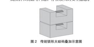 目前廣泛應用的動態軸重地磅的承載臺尺寸般為長(3.2 m) X寬(0.8 m),超寬車道為長(4.0 m) X寬(0.8 m),承載臺面積約為2.56 m2和3.2 m2。 而在靜態加載稱量試驗時,通常采用傳統1 t的鎖形大砝碼,其尺寸約為:長(0.8 m)x寬(0.6 m)x 高(0.52 m),底面積為0.48 m2 (圖2)。在砝碼進行 加、卸載過程中,往往會受限于砝碼自身高度和底 面積的因素,較難控制加載的高度和實現最大量程 的加載,且當砝碼疊加過程中若重心不穩,極易造 成傾斜和側翻等問題,存在較大的安全隱患。