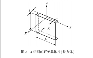 石英晶體的化學(xué)成分為SiO2,外形為六角棱 形;通常我們稱石英晶體的對(duì)稱軸為Z軸或光軸、 通過相對(duì)兩棱且與Z軸垂直的軸線為X軸或電軸、 與X軸和Z軸都垂直的軸線為Y軸或中性軸;X切 割的石英晶體片(長(zhǎng)方體、圓柱體等)是指切割出來 的石英晶體片的兩個(gè)大面積的平面都與X軸相垂 直,如圖2所示。