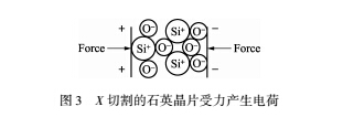 如圖3所示,當(dāng)X切割的石英晶體片沿X軸方 向受一外力作用時(shí),內(nèi)部產(chǎn)生極化,在垂直于X軸 的兩個(gè)平面上產(chǎn)生等量的正負(fù)電荷;當(dāng)X切割的石 英晶體片沿Y軸或Z軸受一外力作用時(shí),則不會(huì)在 垂直于X軸的兩個(gè)平面上產(chǎn)生電荷;這種現(xiàn)象被稱 為縱向壓電效應(yīng)。
